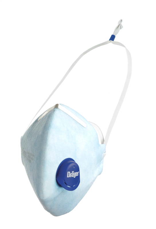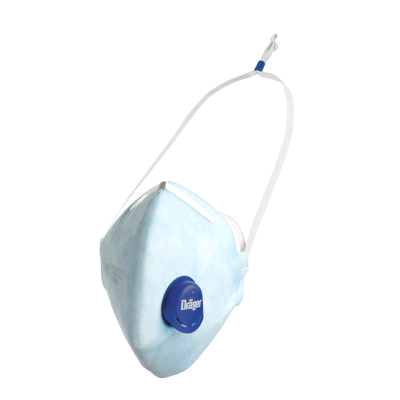 Dräger X-plore 1720+ V FFP2 NR D - folded particle filtering face piece for protection against fine dust as well as solid and liquid particles - certification: EN149:2001+A1:2009 - protection class FFP2 (filter efficiency min 94%) - marking NR: use for max one work shift - marking D: additional dolomite dust test passed - CoolSAFE+ filter material with very low breathing resistance - CoolMAX exhalation valve releases warm and humid exhaled air - harness: length individually adjustable