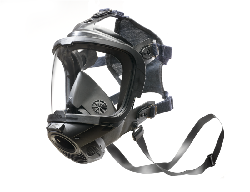 Modern full face mask with Dräger plug-in connector - mask body in size M made of skin friendly, durable EPDM - double sealing frame and triple sealing line for a comfortable and tight fit - nose cup in size 2 - 5-point harness (hairnet) - large visor made of impact and heat resistant polycarbonate with inside anti-fog and outside anti-scratch coating - fog-free thanks to optimal ventilation via inhalation and exhalation valves - good speech transmission by Kapton speech diaphragm - equipped with a transponder - neck strap for carrying the mask before/after use Approved acc. EN136 with CE mark