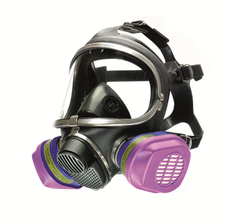 Full face mask with two bayonet-type connectors for using Dräger X-plore bayonet respiratory filters.